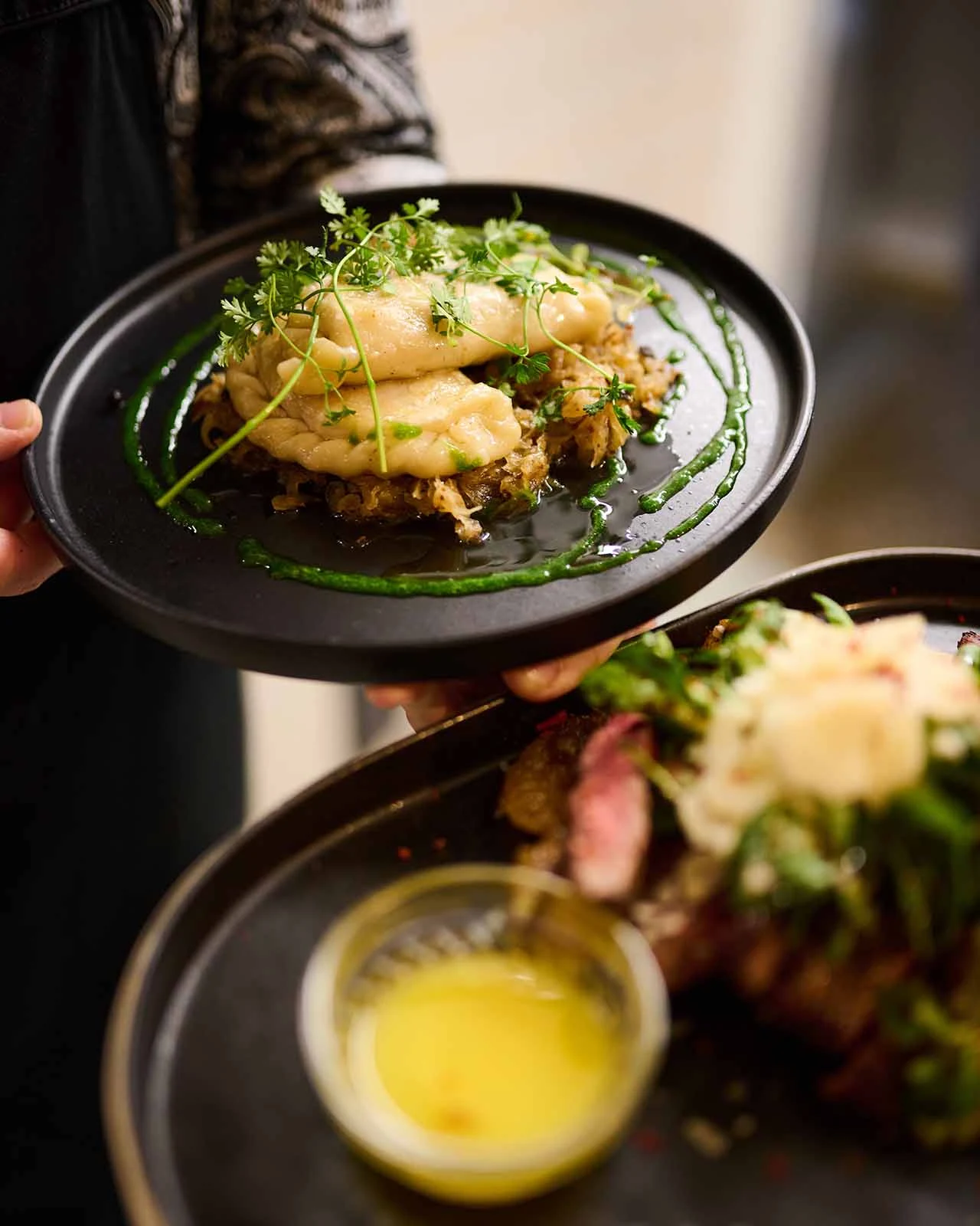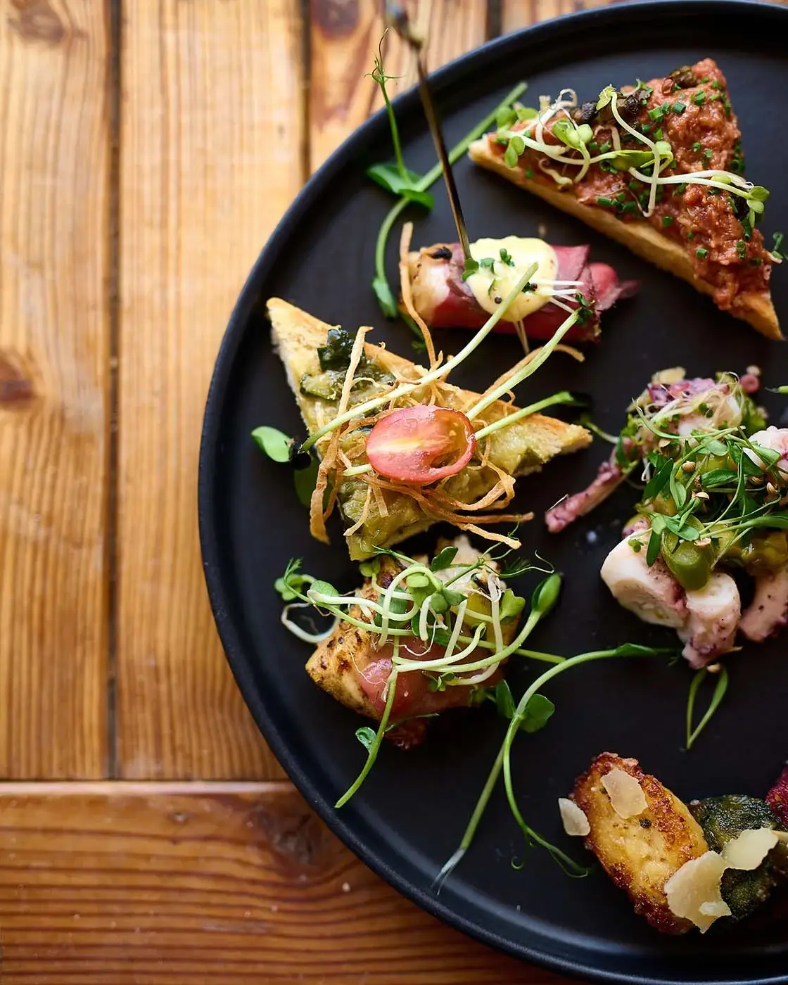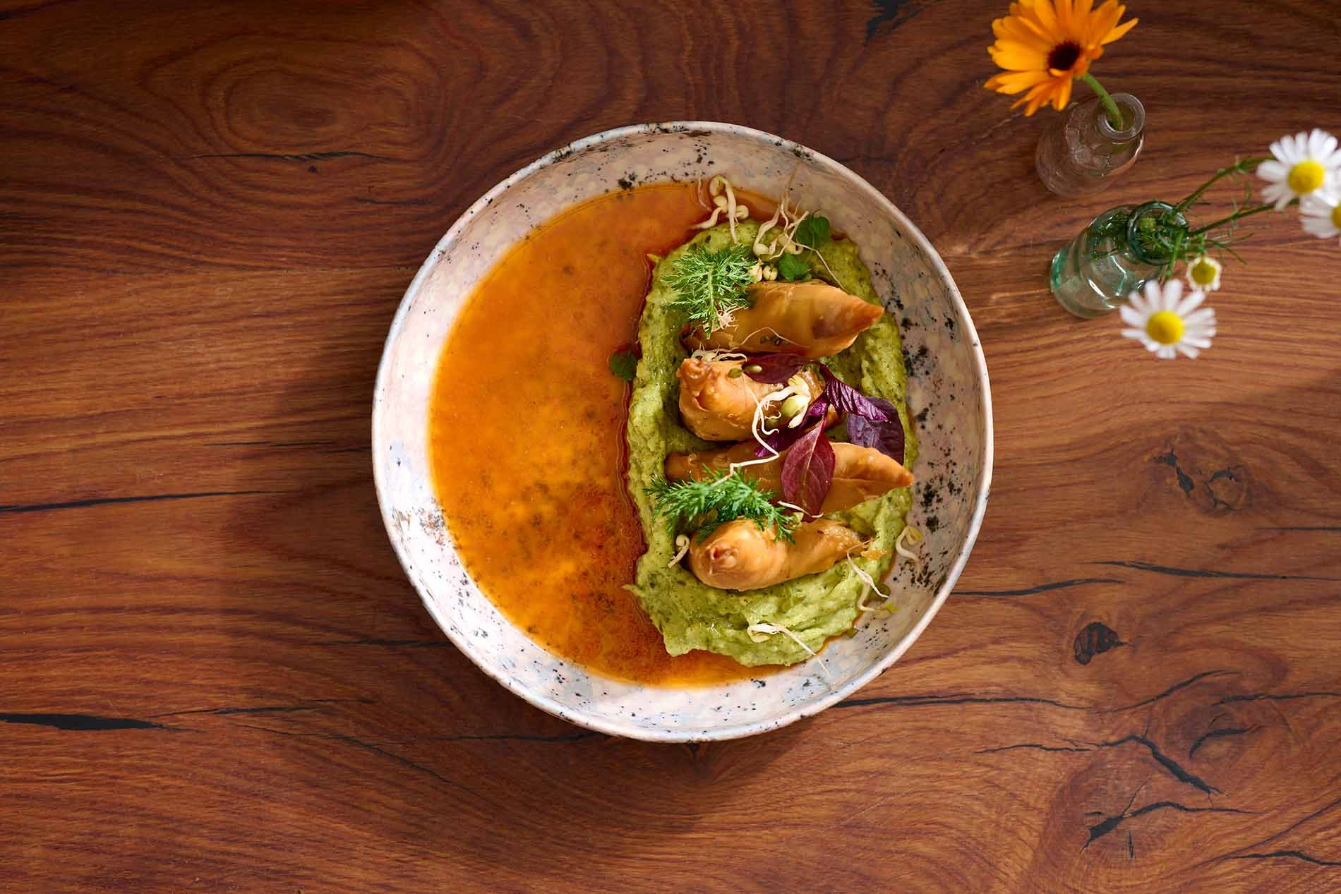 Modern angerichtete Vorspeisen mit regionalen Zutaten – kreative Kärntner Küche bei Geschmackssache.