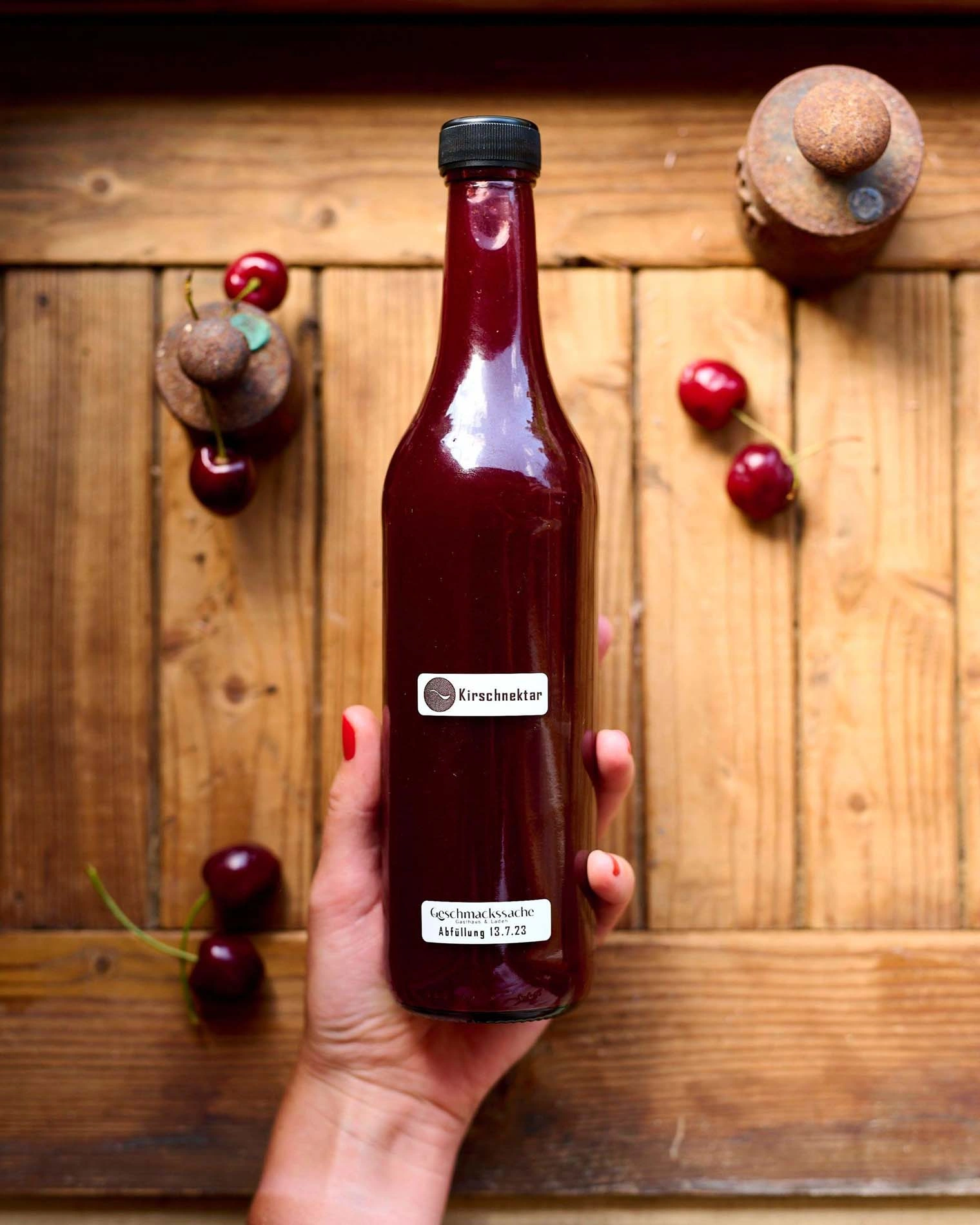 Regionale Fruchtsaftflasche auf rustikalem Holztisch – hausgemachte Getränke im Geschmackssache Laden.